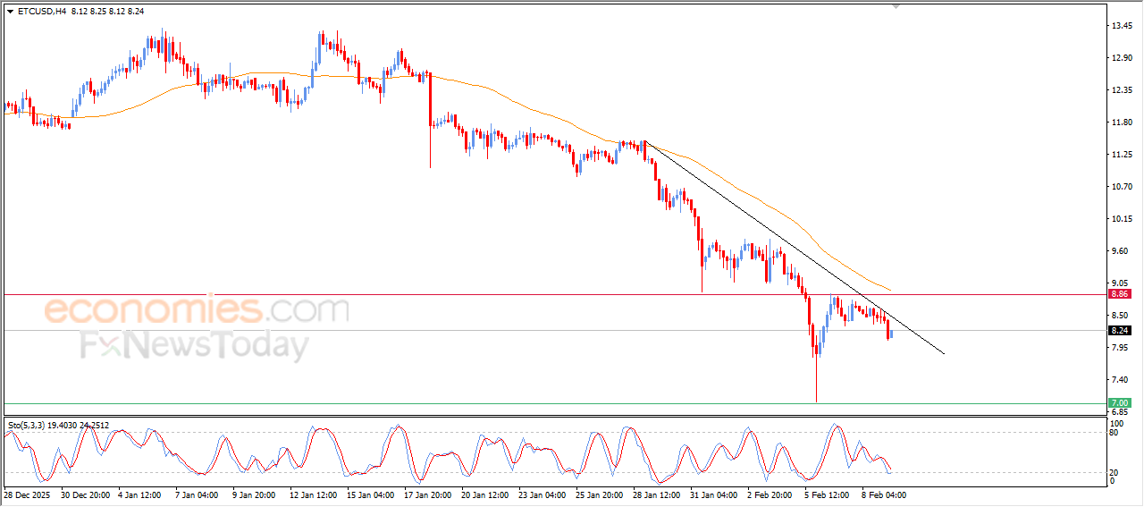 سجل سعر زوج ETCUSD انخفاضًا مستمرًا خلال جلسة التداول الأخيرة، تحت تأثير الاتجاه الهبوطي الرئيسي قصير الأجل، حيث تحرك السعر على طول خط اتجاه ثانوي يدعم هذا المسار الهبوطي. ولا يزال الضغط السلبي مرتفعًا نظرًا لتداوله دون المتوسط المتحرك البسيط لـ 50 يومًا، مما يزيد من مخاطر الهبوط، خاصةً مع استمرار الإشارات السلبية من مؤشر القوة النسبية (RSI)، على الرغم من وصول المؤشر إلى منطقة ذروة البيع.