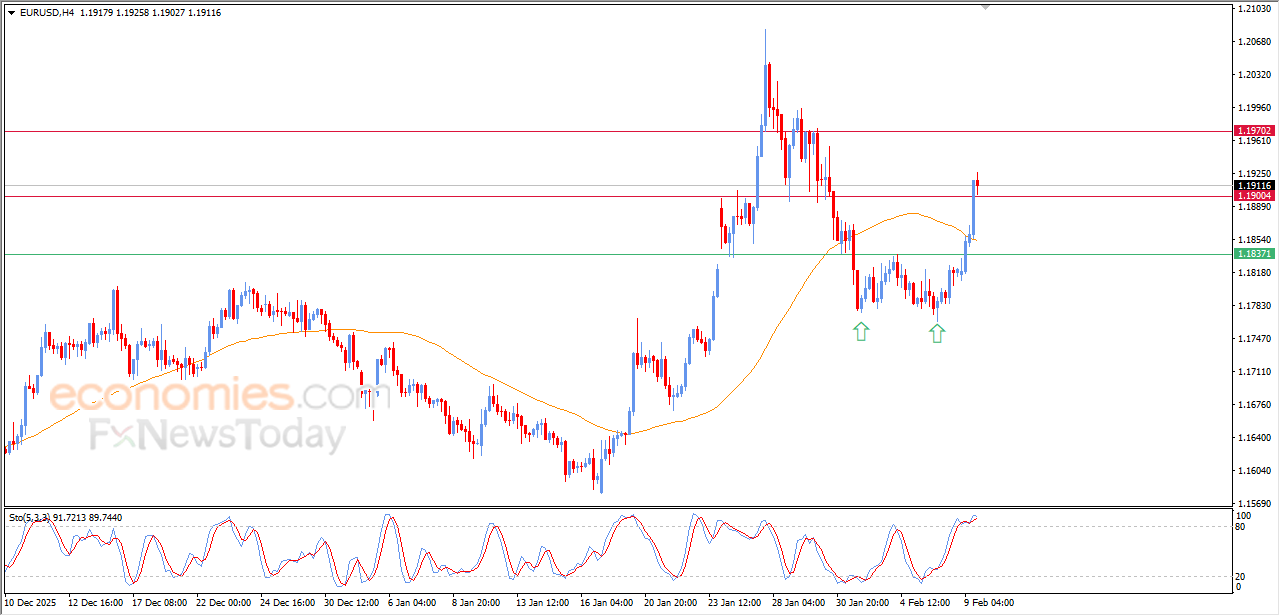 ارتفع زوج اليورو/الدولار الأمريكي (EURUSD) بشكل ملحوظ في آخر جلسة تداول له خلال اليوم، متأثراً بتكوين فني إيجابي قصير الأجل، والذي يتمثل في نمط القاع المزدوج، ليتجاوز الضغط السلبي لمتوسط الحركة الأسي 50، مدعوماً بالإشارات الإيجابية من مؤشرات القوة النسبية، على الرغم من وصوله إلى مستويات ذروة الشراء، ليخترق مستوى المقاومة الحالي عند 1.1900، ويمثل هذا المستوى هدفنا المتوقع في تحديث توقعات اليوم.