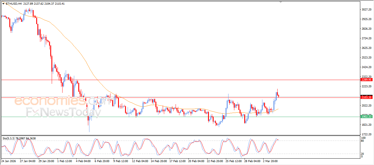 انخفض سعر (ETHUSD) في آخر تداولاته على مستويات اليوم، ليجمع مكاسب ارتفاعاته السابقة، محاولاً اكتساب زخم صعودي قد يساعده على التعافي والارتفاع مرة أخرى، إلى جانب التخلص من بعض ظروف التشبع الشرائي الواضحة على مؤشرات القوة النسبية، خاصة مع ظهور إشارات متداخلة سلبية، وسط هيمنة موجة تصحيحية صعودية على المدى القصير، مع دعم ديناميكي يتمثل في تداوله فوق المتوسط المتحرك الأسي 50، مما يعزز فرص التعافي على المدى القريب.