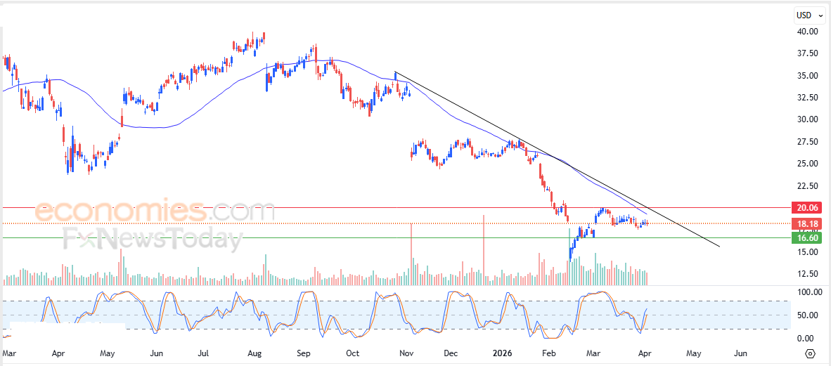 لذلك نتوقع أن ينخفض سعر السهم خلال جلسات التداول القادمة، طالما بقي مستوى المقاومة عند 20.00 دولارًا سليمًا، مستهدفًا مستوى الدعم الأول عند 16.60 دولارًا.
